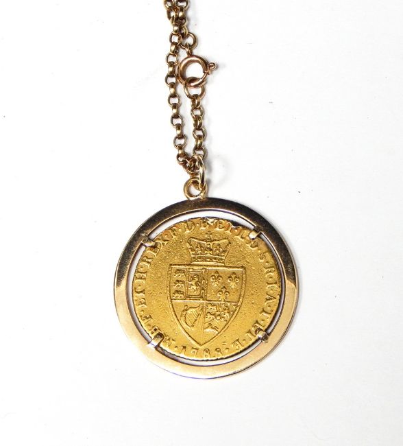 Georgian-style spade guinea bearing date 1788 and a 9ct gold belcher-link chain