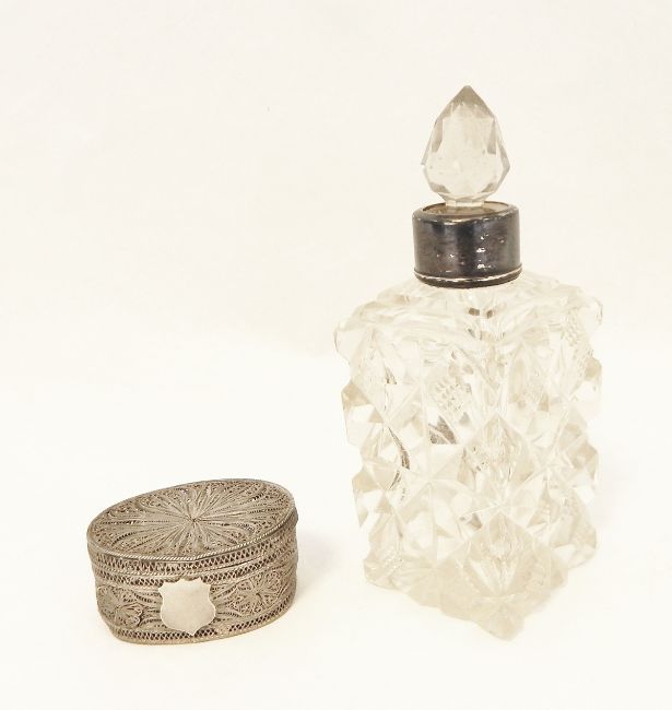 Cut glass scent bottle with silver collar together with a foreign white metal filigree silver oval pill box (2)