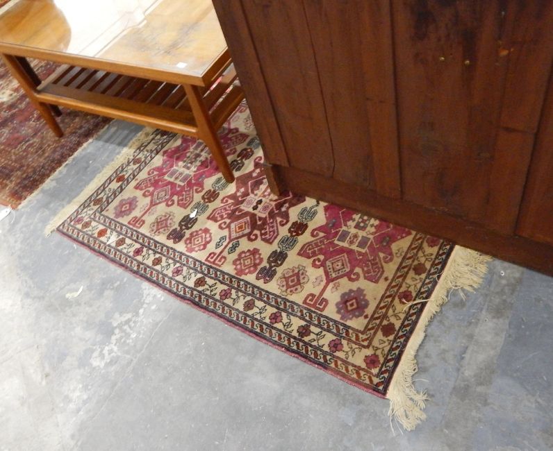 A Persian style rug, crimson on a buff ground 116 x 90 cms
