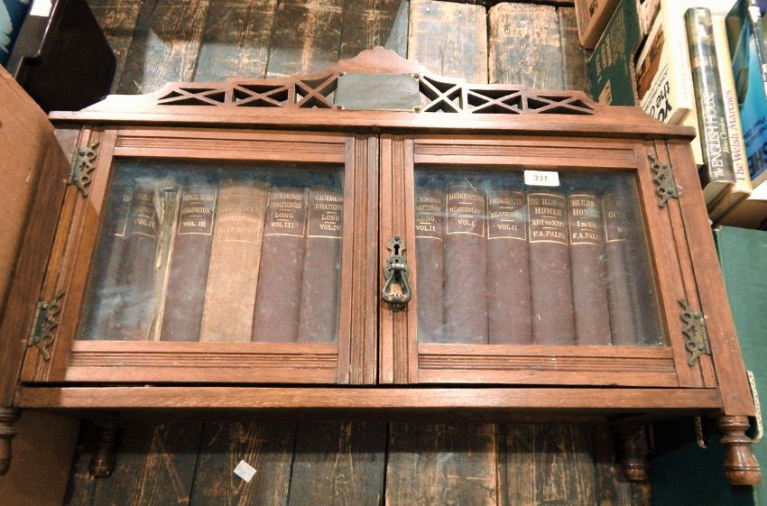 A small fitted bookcase, bearing a presentation plaque 'Presented to H D White Esq from his pupils past and present on his leaving Sheerness December 1880' containing thirteen vols Cicero, Virgil, Heroditus, Homer