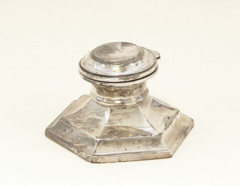 George V silver inkwell of hexagonal form with hinged cover, Chester 1913 together with a silver-mounted spectacle case with belt hook (2)