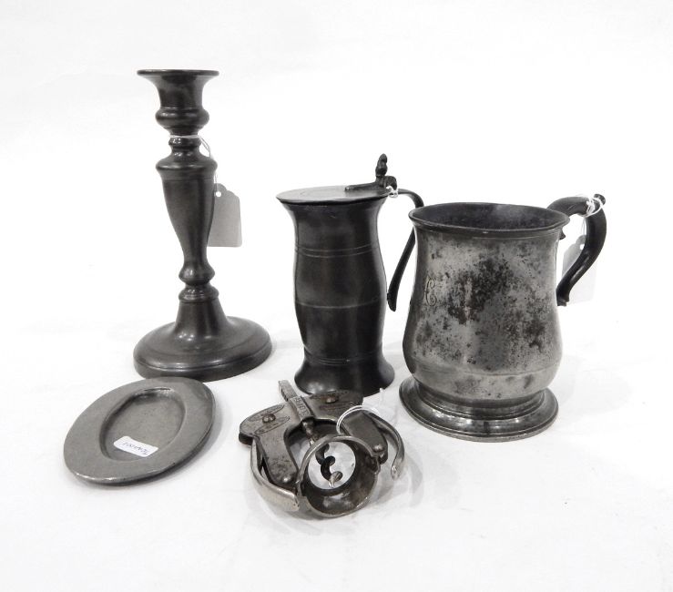Victorian pewter mug, a pewter candlestick, inkwell, etc.