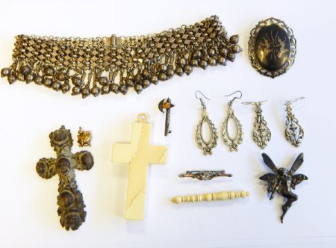 Indian silver-coloured metal choker tassel, two silver bar brooches, sundry silver and other jewellery (1 box)