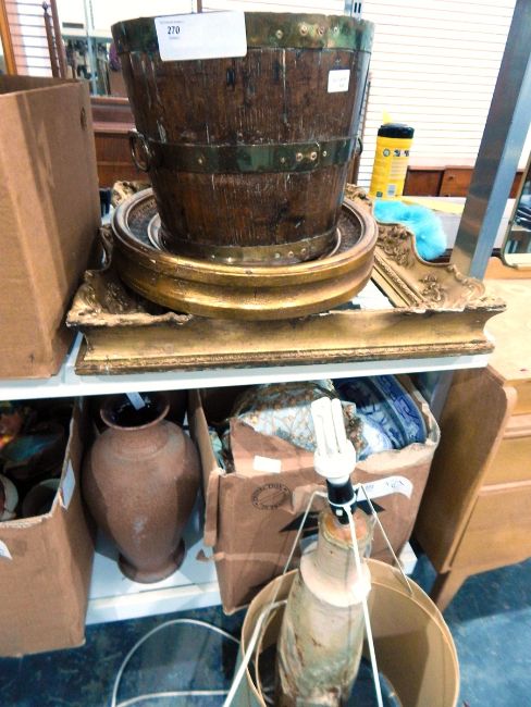 Mirror within a gilt gesso frame, heavily carved, a circular mirror within a gilt carved wooden frame and half barrel, banded with brass, carry rings but lacking the base (3)