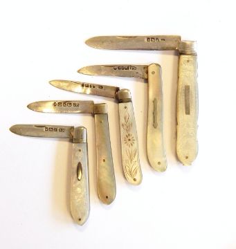 Five Victorian silver-bladed folding fruit knives with mother-of-pearl scales, various dates 1840-1900 (5)