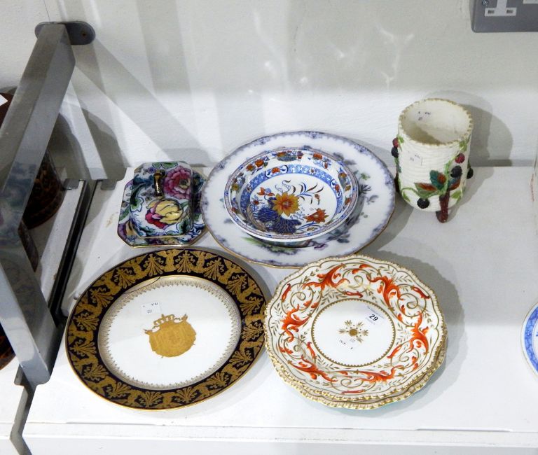 19th century French porcelain plate, the centre with an elaborate gilt coat of arms with coronet above, within a border of eagles and garlands, in gilt on a blue ground, marked 'M.Imp le de Sevres' to reverse, 24cm diameter (damaged), a pair of 19th century plates decorated foliate scrolls in orange and gilt and various other items (8)