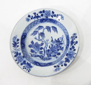 Pair of 19th century Chinese bowls, each decorated with a tree and chrysanthemums within a diaper border, 24cm diameter and another blue and white bowl (3)