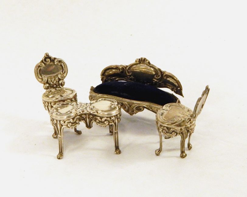 Edwardian silver suite of miniature furniture viz: settee, stool and two chairs all rococo repousee, by Henry Matthews, Birmingham 1901 and 1902