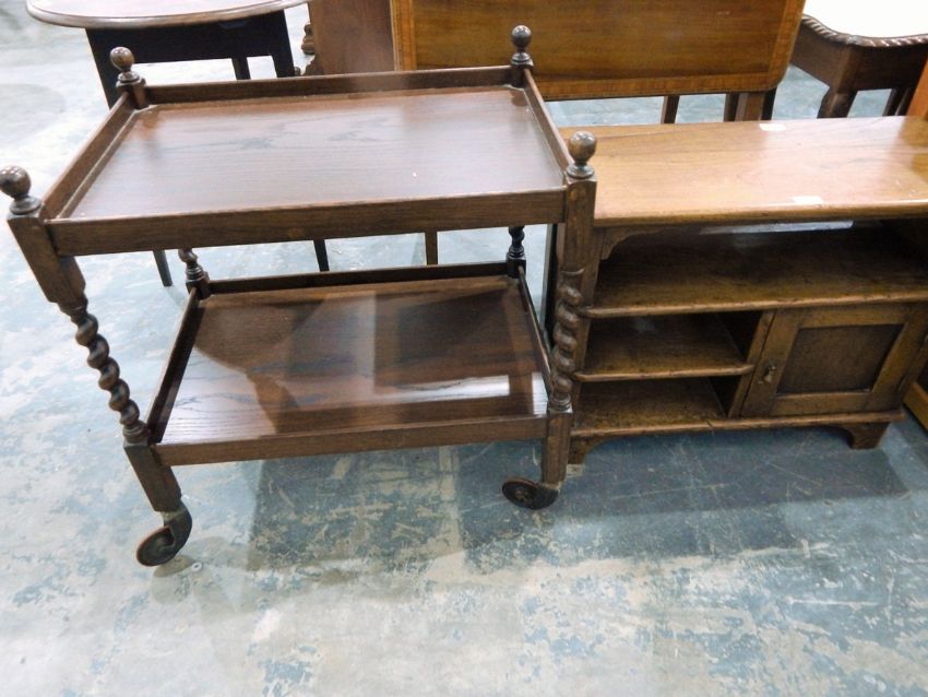 Modern oak telephone table with undershelf and cupboard together with a two-tier tea trolley on spirally twisted supports and castors (2)