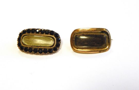 19th century gold coloured metal morning brooch with hair centre and facet cut black paste surround and another 19th century gilt metal morning brooch (2)