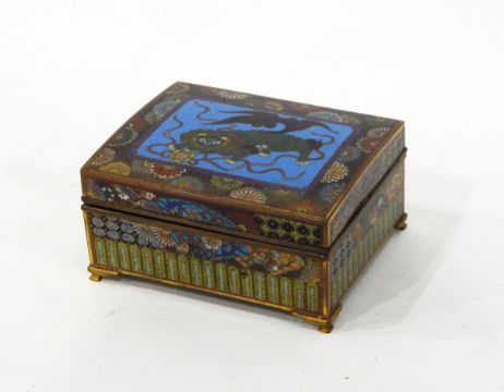 Early 20th century cloisonne box of rectangular form, the hinged cover decorated with a dog of fo and flaming pearl within a border of stylised chrysanthemum heads, the sides decorated with geometric patterns and fans, the interior engraved with birds and irises, 12cm long