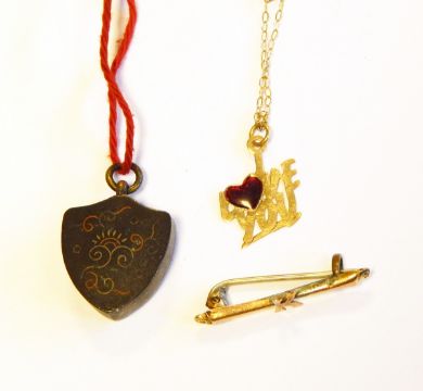 9ct gold "I love you" pendant and a fine gold link chain, pendant compass in shield shaped surround and a gold coloured bar brooch surmounted with letter 'K' (3)