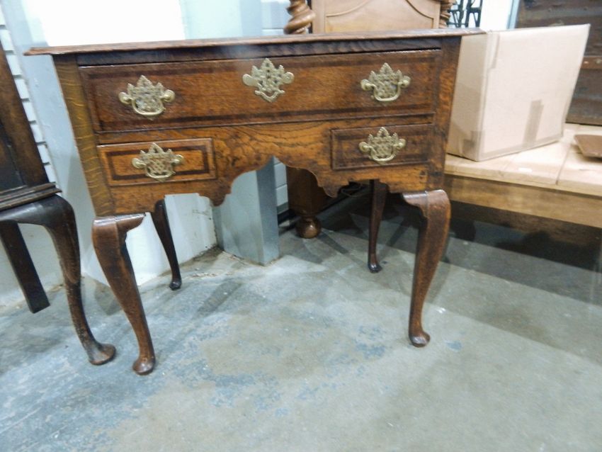 George III oak cross-banded lowboy with one long and two short drawers, on shaped supports and pad feet, 82cm wide