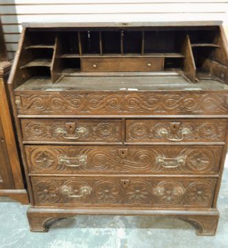 Oak bureau, the fall to reveal fitted interior, two short and two long drawers with scroll and floral decoration, swan neck handles, on shaped bracket feet (fall has come off completely), 92cm wide