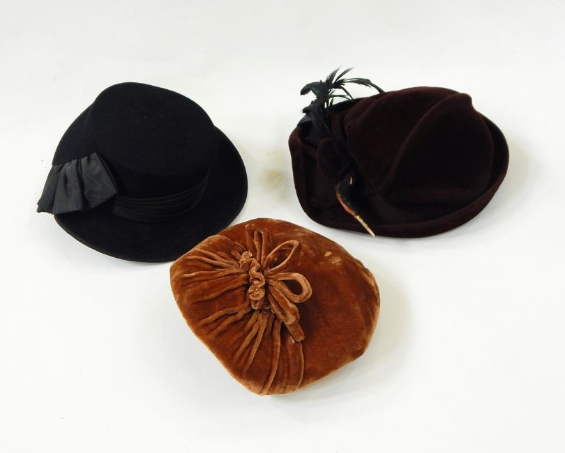 Two 1950s hats with feather decoration (one black, one burgundy), black 1930s velour hat, brown 1950s velvet cap, black 1950s ribbon back hat and a 1930s shallow crowned hat in neutral tones (6)