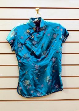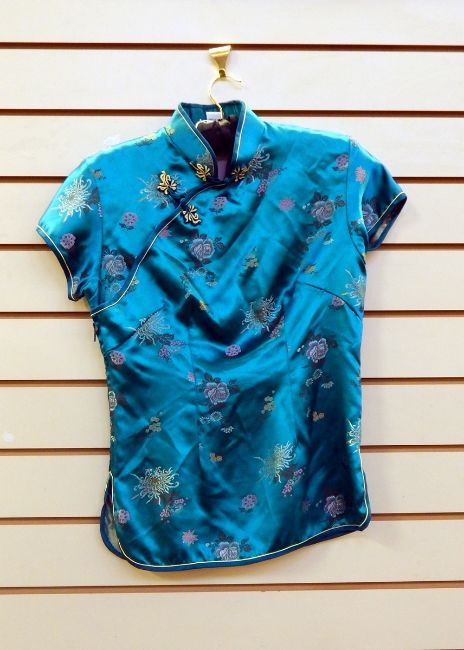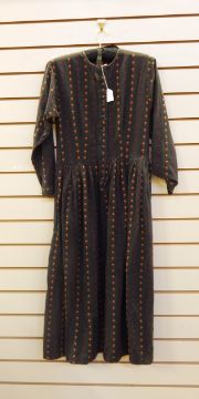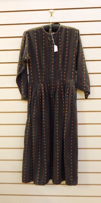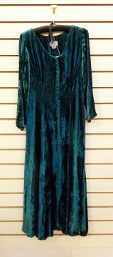 Adini emerald green ankle length velvet button-through sleeved dress, a Monsoon full-length drop-waist long sleeved cotton dress and a 'Yue Hwa' emerald green Oriental jacket decorated with a flower pattern (3)