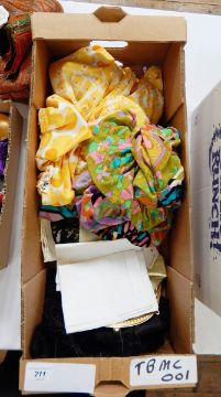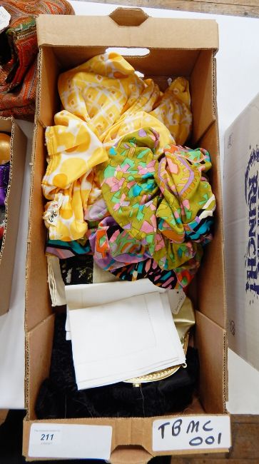 Persian lamb scarf, a gold evening bag, two handkerchiefs, four scarves, a 1970's pyschadelic-pattern by Leonard and a 1970's yellow maxi dress with a hood, labelled 'Quiesser'(?) (1 box)