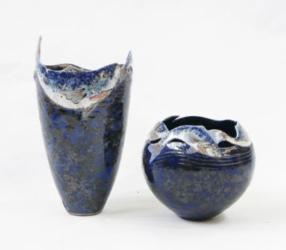 Roger Cockram vase of bulbous form with fish swimming to rim, 15cm high together with a matching tapering vase, 23cm high