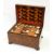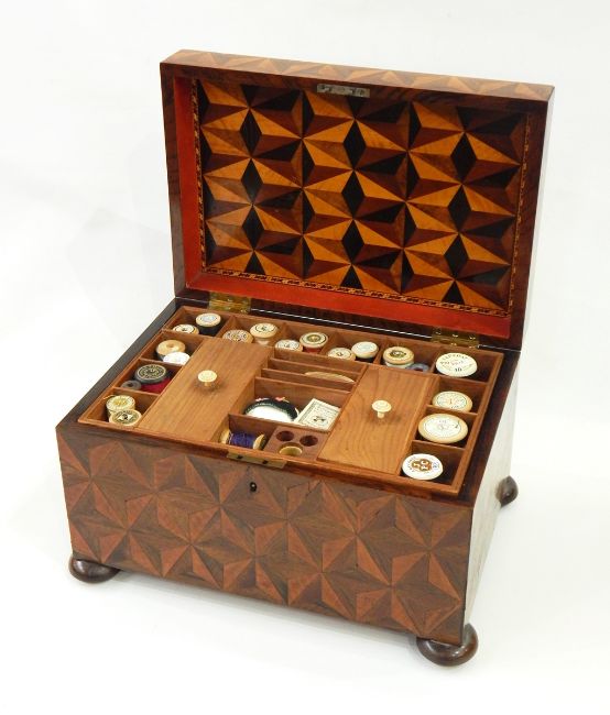 19th century parquetry sewing box, all over with geometric parquetry veneers, the interior with fitted tray containing silks and cottons and other sewing items, bun feet, approx 36cm wide