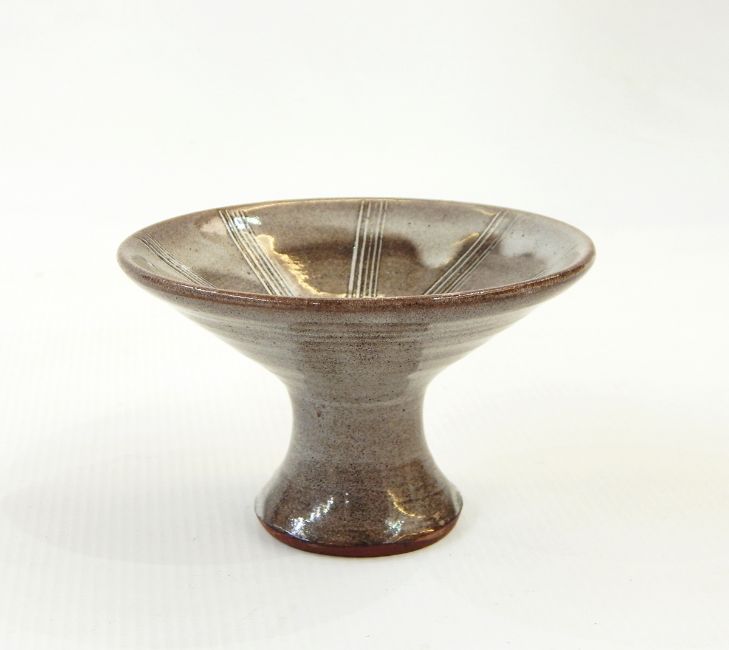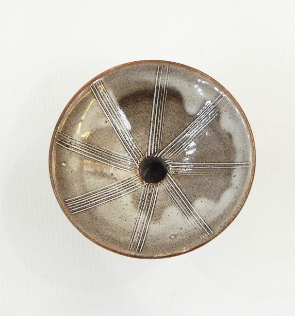 David Leach grey glazed candlestick with concave side stem, flared rim and tapering and flared base, stamped to base, 10cm wide