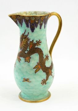 Crown Devon Mattajade water jug of tall baluster form with green ground, Oriental pattern with dragon, 23cm high