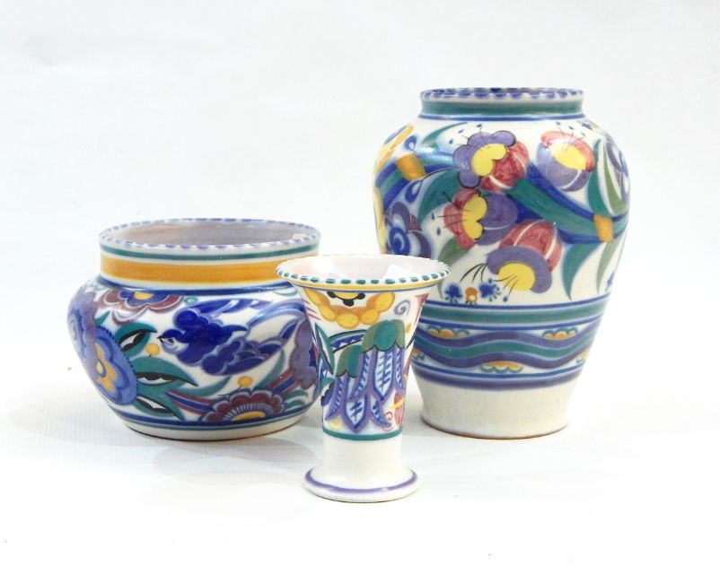 Carter Stabler Adams Poole pottery vase, 'Bluebird' pattern, ovoid, signed and stamped to base with two other floral vases and an egg cup (6)