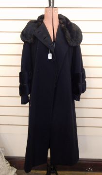 1930's black wool coat labelled 'Bradleys, Chepstow Place, London, W2', the sleeves serve as a cape, the whole trimmed with dyed black coney, the buttons offset from the centre with a dyed coney stole (2)