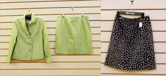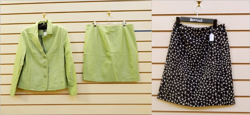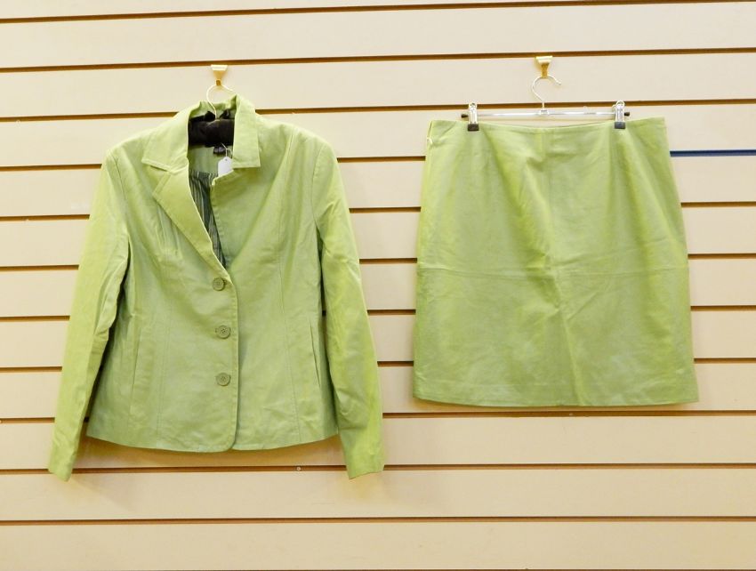 Apple green leather suit by Dialogue, a black and white Gianni Versace skirt (3)