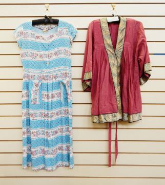 1930's short sleeved dressing gown, full-length with tie waist, another 1930's dressing gown with padded shoulders, double-breasted four-button front, black turnover to sleeves, full length with tie belt, a 1950's cotton dress with pockets, short sleeves, labelled 'Courtaulds' with a 1920's pink wool kimono-style top detail Paisley-patterned silk (a little moth wear (4)
