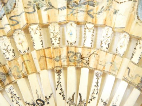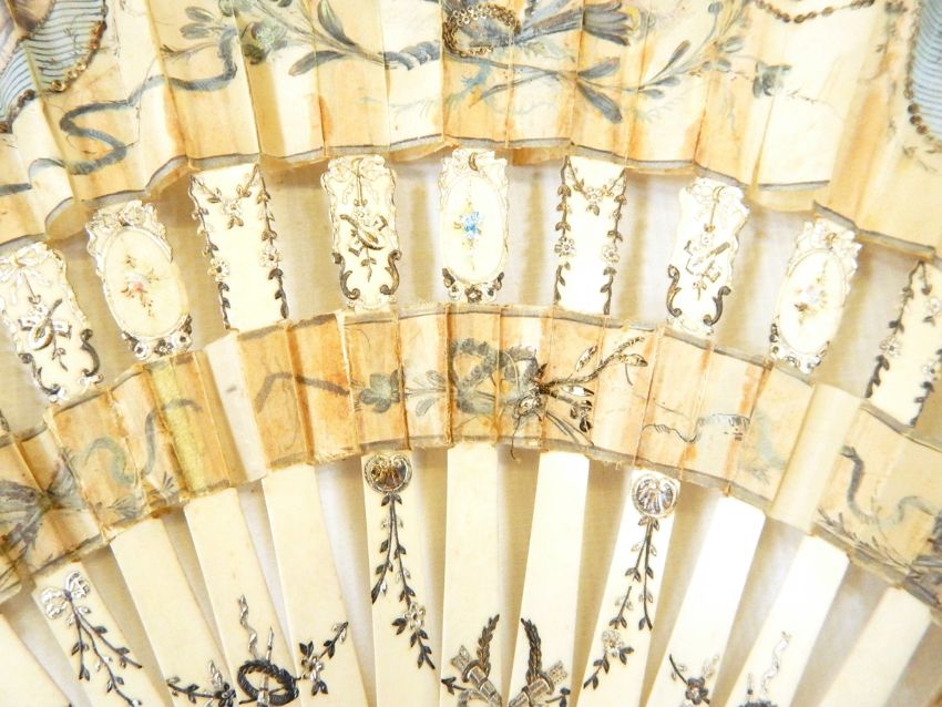 19th century silver inlaid, ivory and painted silk fan decorated with panels of figures and floral swags (af)