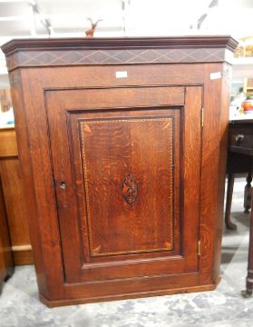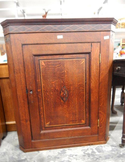 George III oak and boxwood inlaid corner cupboard with inlaid cornice, the door with inlaid chequerwork and central pattera, enclosing shelves, width 87cm