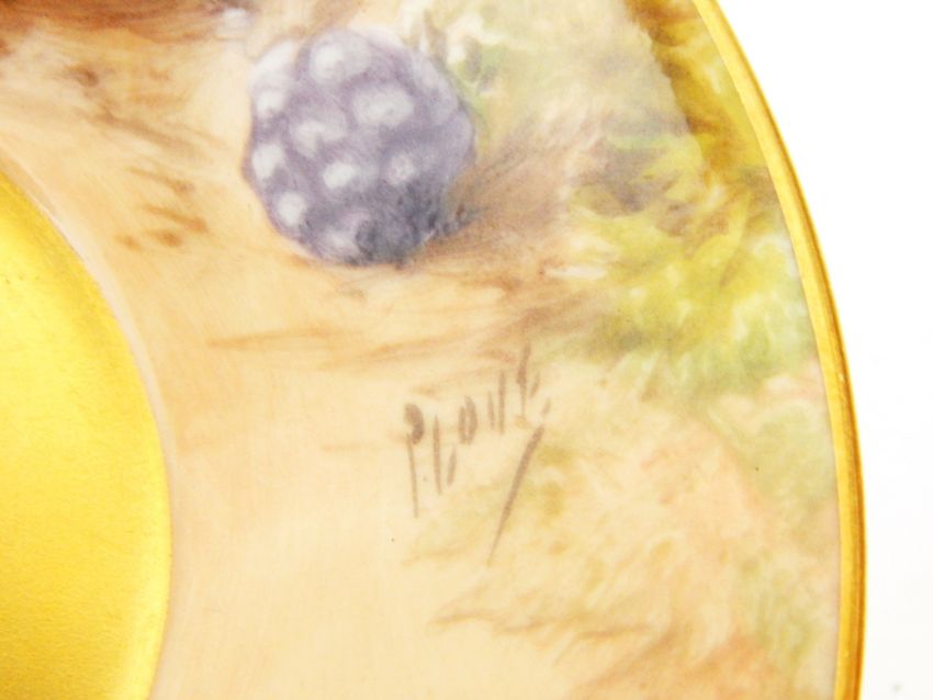 Matched pair of coffee cans and saucers, predominantly mid 20th century, gilt interiors and handle with handpainted fruit, by P Love and E Townsend, having black transfer mid 20th century printed marks to base, one earlier saucer dated 1901