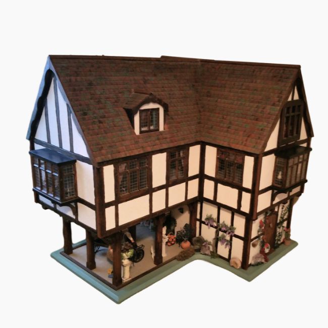 Tudor-style large doll's house, modelled on a Ledbury town house, fixed onto a table, with gable end, electricity, also complete with fittings for all the rooms and the garden