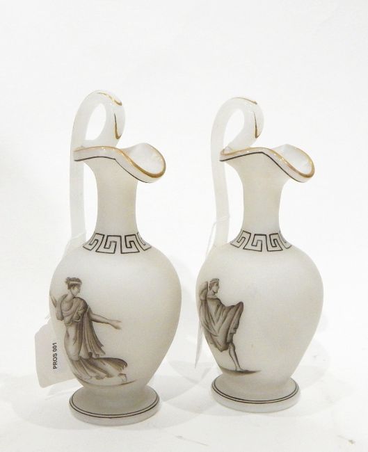 Pair of Victorian Richardson's Vitrified glass ewers, each painted with figures en grisaille within Greek key borders, with painted mark and Victorian registration mark to base, 22cm high and four other Victorian glass vases (6)