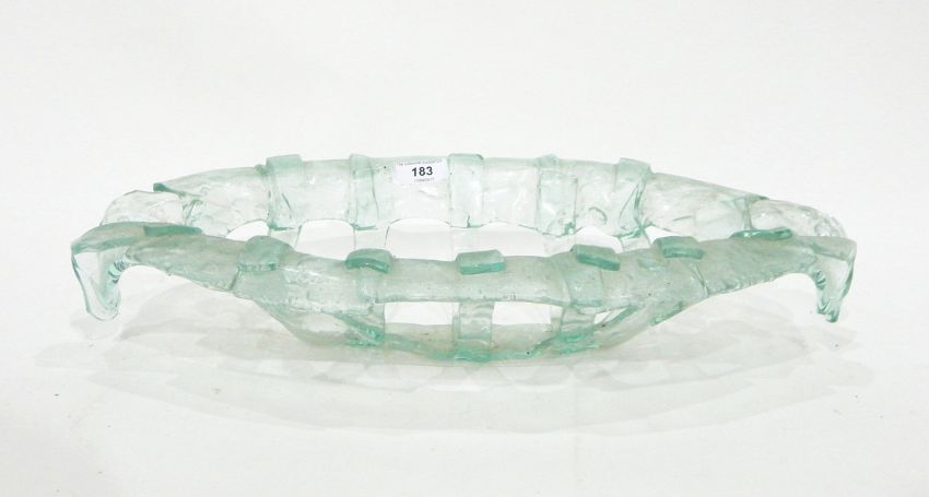 Modern glass bowl of oval design formed of strips of glass, 49cm long