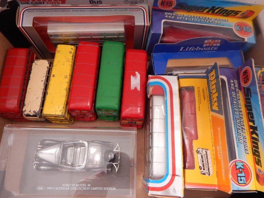 Quantity of diecast buses to include Corgi Toys London Transport Route Master, Dinky Toys 290, blister pack buses by Corgi, Dinky, Superkings, etc. together with a 1990 calendar collection limited edition model of a Ford V8 model 48, cased (1 box)