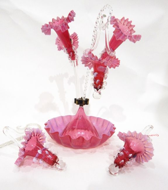 Late Victorian opaline glass epergne, the central trumpet surrounded by two further trumpets and two spiral supports with hanging baskets, with applied green glass decoration over a central bowl base, 54cm high