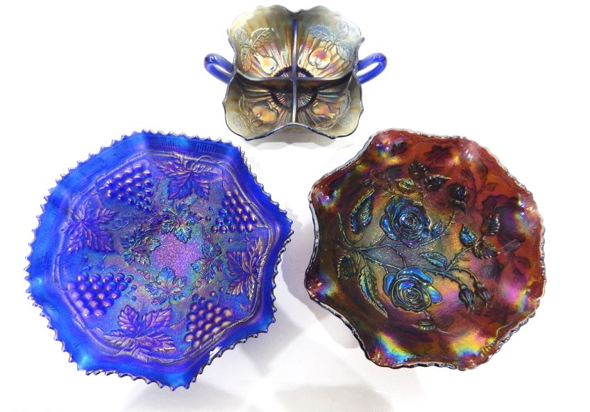 Carnival glass bowl decorated with a swan and five other bowls (7)