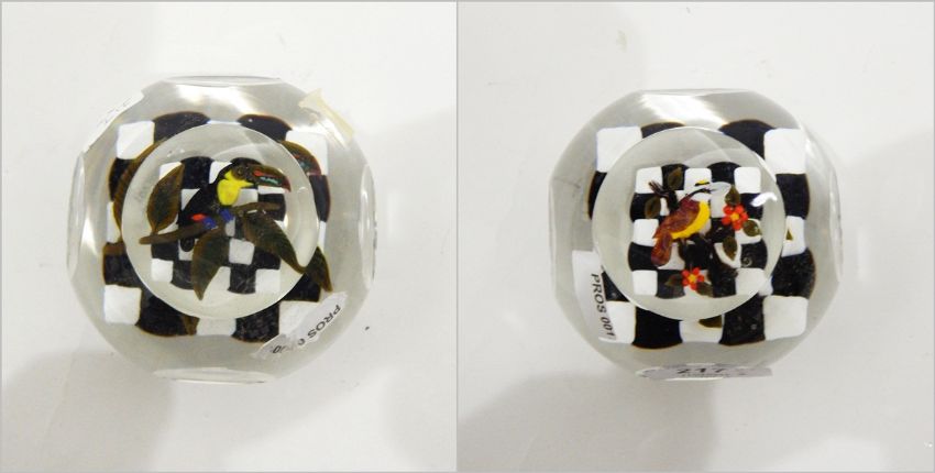 Matched pair of glass paperweights by John Deacons of circular form with faceted viewing panels, one with a lampwork toucan on a branch, the other also with a lampwork bird on a branch, with white and black chequerboard grounds, with JD signature canes to base, approx. 9cm diameter