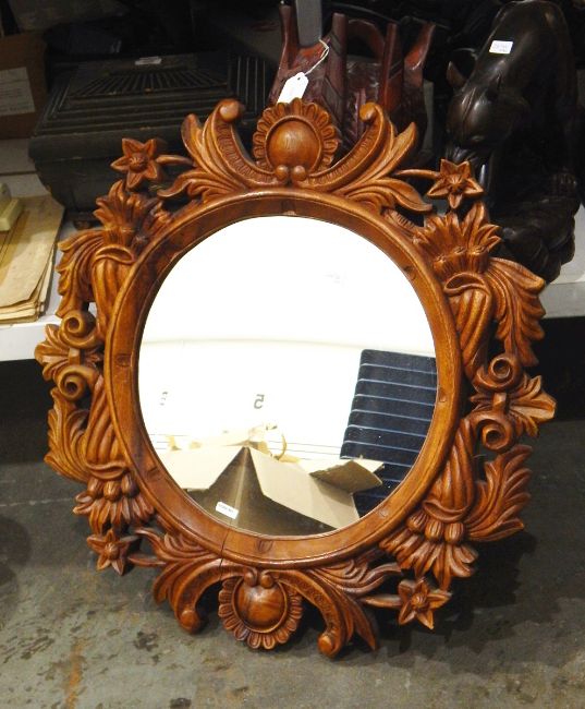 Carved wooden model of a panther, mask and circular mirror with carved pierced surround