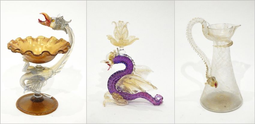 Venetian glass jug with gold decoration, the handle modelled as a dragon, a copper glass comport, the opalescent stem modelled as a winged beast, a glass candlestick supported by a purple winged beast and one other item (4)