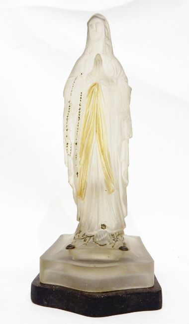 Early 20th century moulded frosted glass standing figure of the Virgin Mary, with painted decoration of her robes and rosary, with integral candle holder behind, on shaped rectangular base mounted on a wooden base, 39cm high