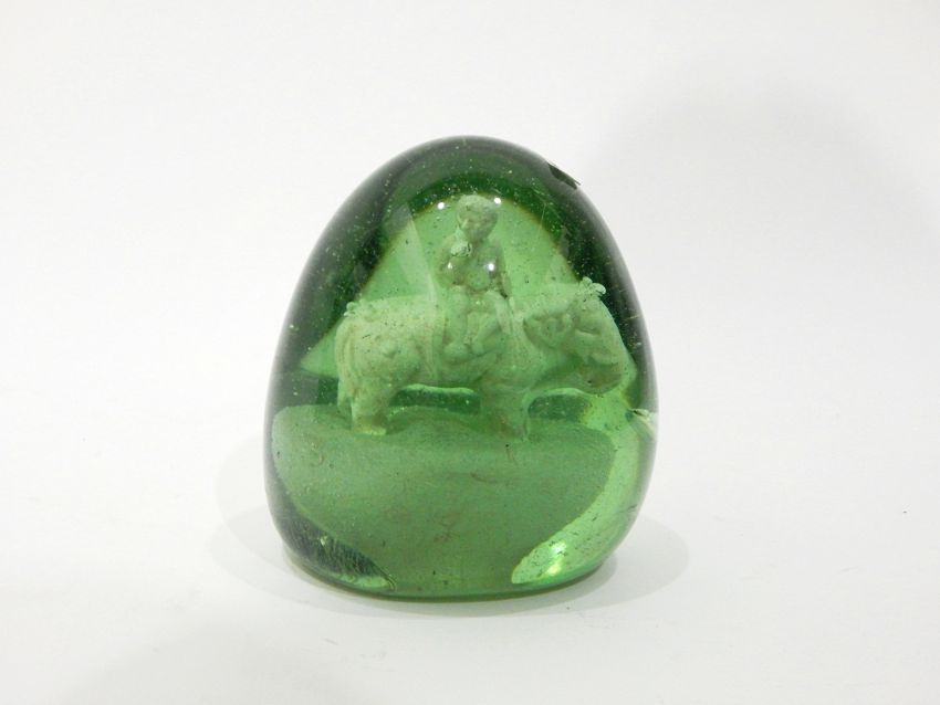 Victorian large green glass dump paperweight with internal decoration of a figure seated on an elephant, approx. 12cm high