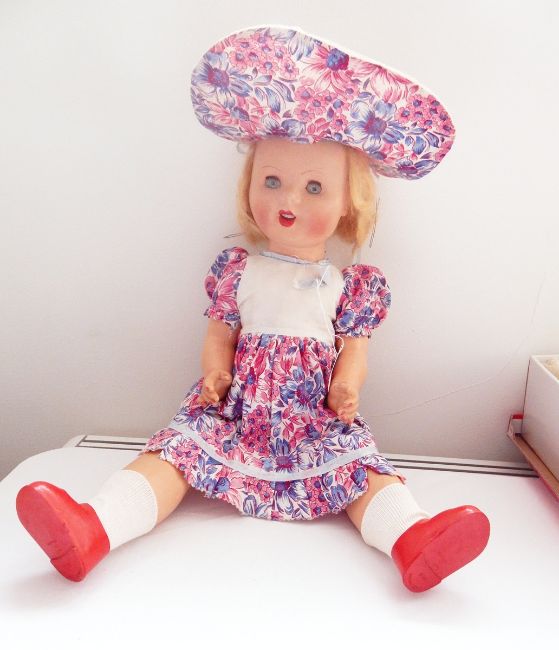 1950's/60's composite doll with speaker box in her back, with some vintage baby clothes