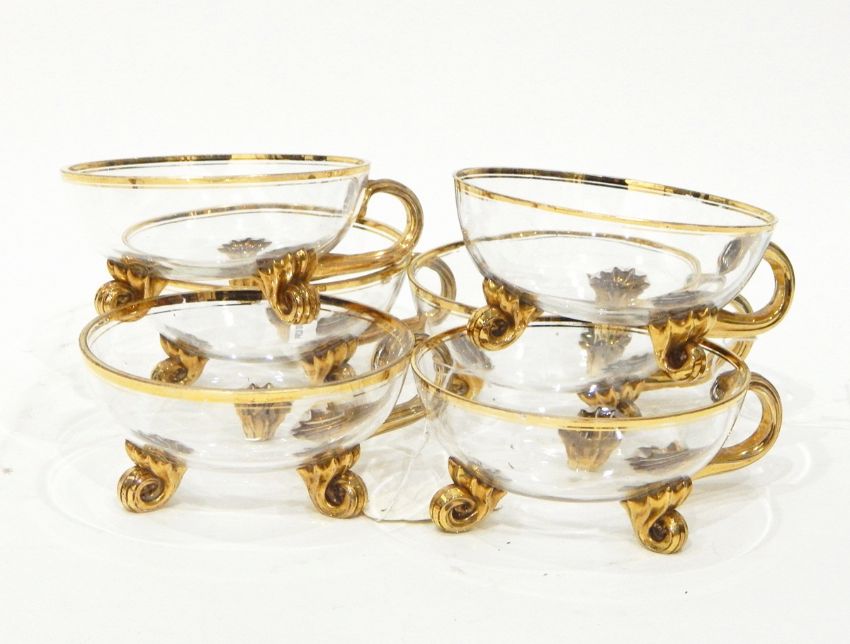Art Deco blue glass pedestal bowl, the stem modelled as a dancing lady, with frosted panels to the bowl, 27cm high, a green glass bowl decorated with carp, a punch set comprising six cups and a bowl with gilt rims and feet and various other items (13)