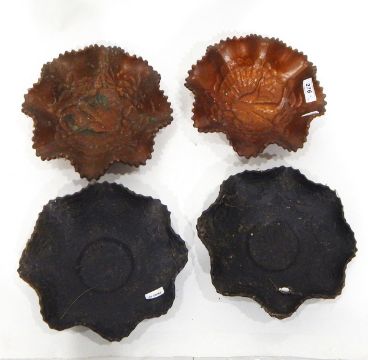 Pair of late 19th/early 20th century cast iron crinkle plates with moulded aesthetic-style decoration and a similar plaster pair, all in the style of carnival glass (4)