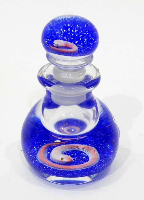 Glass scent bottle by John Deacons of bulbous form with both the stopper and body decorated with a white and orange snake, on a blue mottled ground, with JD signature cane, approx. 14.5cm high and a glass paperweight by John Deacons of domed circular form with a white and orange snake on a green ground, with JD signature cane and with paper label to base, 8.5cm diameter (2)