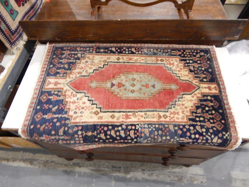Small handmade Persian rug with blue ground, central pink and beige geometric motif, with figural field surround of figures and plants, having narrow stylised floral frieze, 98cm x 68cm