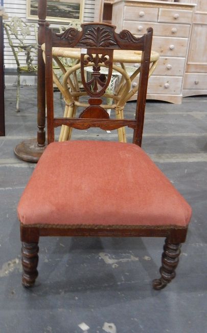 Circular topped bamboo occasional table, an Edwardian nursing chair and a standard lamp with shade (3)