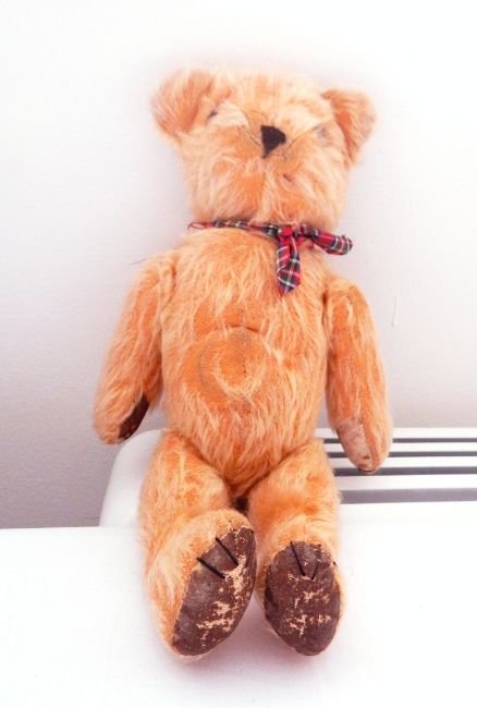 Early bear with tartan ribbon around his neck, 34cm approx (very worn and growler not working)